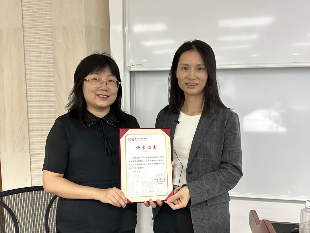 本次课程,除了介绍期货市场知识外,周老师还从期货市场从业者角度为同学们深度分析就业岗位及职业路径,拓宽了同学们未来的职业规划方向。在热烈的讨论气氛中,本次《证券市场前沿与实务》系列讲座圆满结束。课后,金融学系主任戴芸副教授代表学院为周老师颁发了讲学证书。