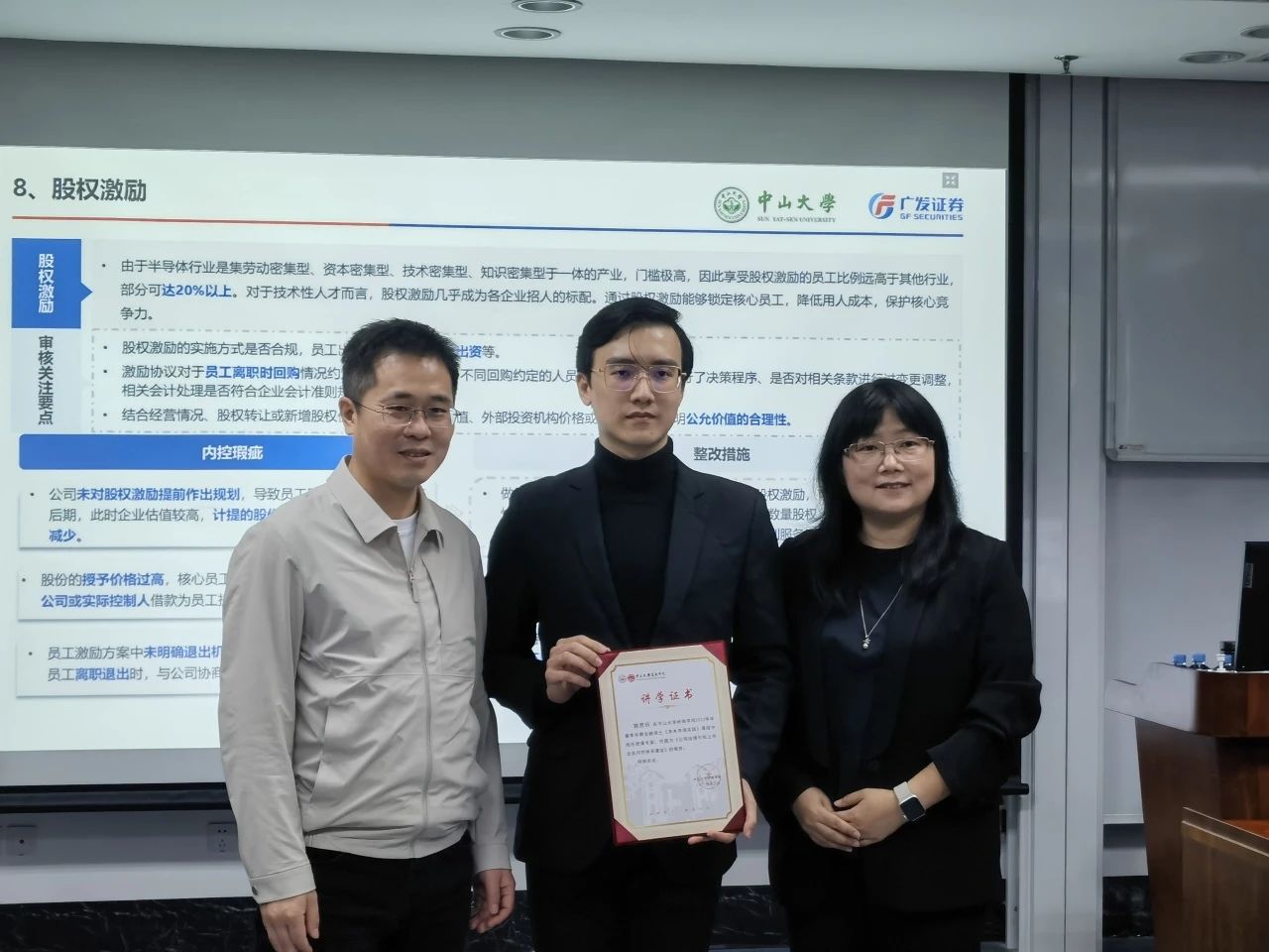 本次课程,除了介绍资本市场的相关知识外,郭老师引用招股说明书、OECD和监管政策的有关表述,在充分考虑同学们的专业基础上解读公司治理和内部控制的含义,结合实务经验,深度分析相关部门的设置、就业岗位及职业路径,为同学们提供丰富的经验参考,拓宽了同学们未来的职业规划方向,并为同学们准备了有关半导体行业分析的课后阅读内容。在热烈的讨论气氛中,本次《资本市场实践》系列讲座圆满结束。课后,岭南学院院长助理、专硕教育中心主任柳建华教授和金融学系主任戴芸副教授代表学院为郭老师颁发了讲学证书。