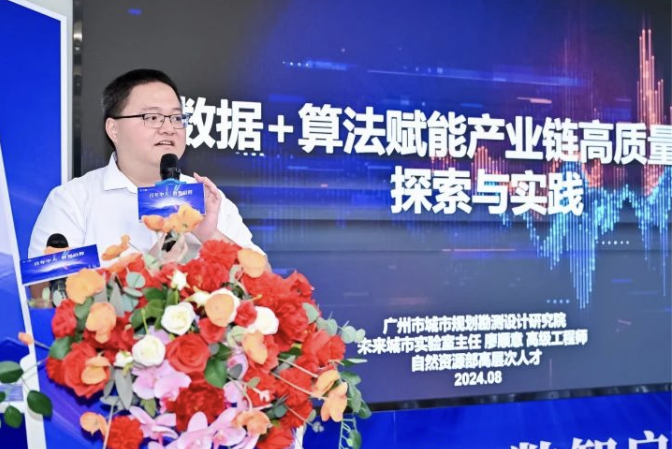 接着,广州市城市规划勘测设计研究院未来城市实验室廖顺意主任以《数据+算法赋能产业链高质量发展的探索与实践》为主题,结合规划院工作内容,从产业数据库的建立、数据的场景价值支撑到未来产业技术锚定与产业导入,分享了数据在产业链发展过程中的实践与应用。