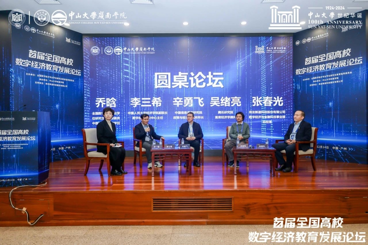 圆桌论坛环节由全国数字经济教指委委员、中国科学院大学学位办公室主任乔晗主持,中国人民大学经济学院副院长、数字经济研究中心主任李三希,腾讯研究院首席经济学顾问吴绪亮,中国信息通信研究院政策与经济研究所所长辛勇飞以及用友新道科技股份有限公司数字经济与金融科技事业部总经理张春光参与讨论。