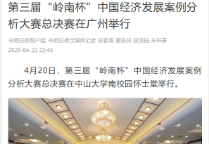 4月20日下午,第三届“岭南杯”中国经济发展案例分析大赛总决赛在yl9193永利集团南校园怀士堂举行。本届“岭南杯”受到光明日报、新华网、中国社会科学报、中国青年报、中国新闻网等在内的多家国内主流媒体的关注报道。